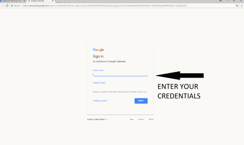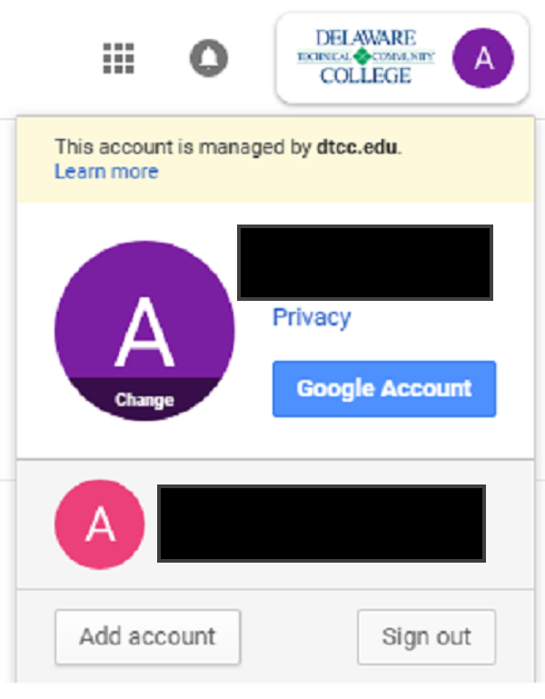 Step 3: Once you have clicked on Add Account you will be able to enter in your personal Google account and navigate back and forth between Delaware Tech’s account and the newly linked account.